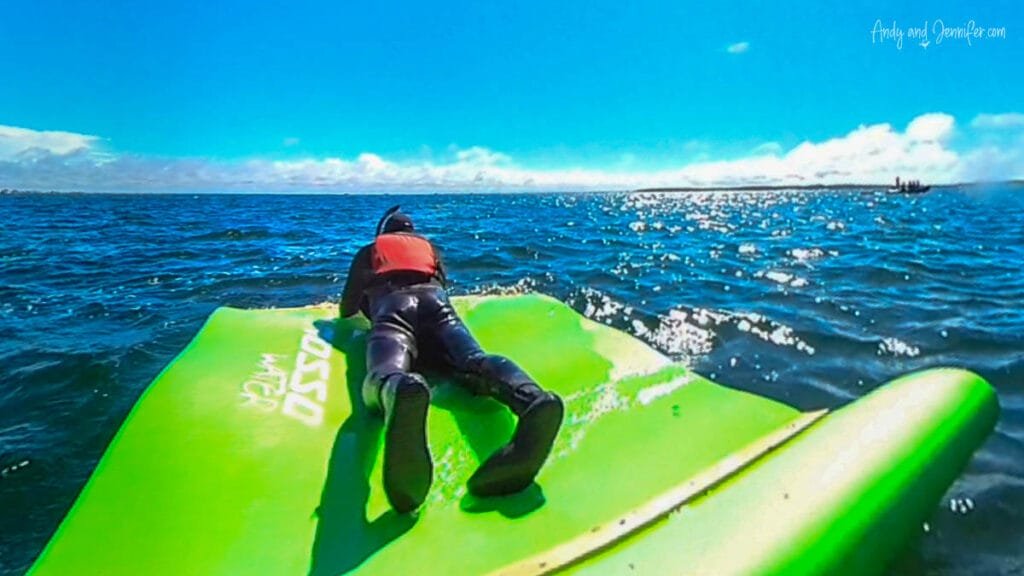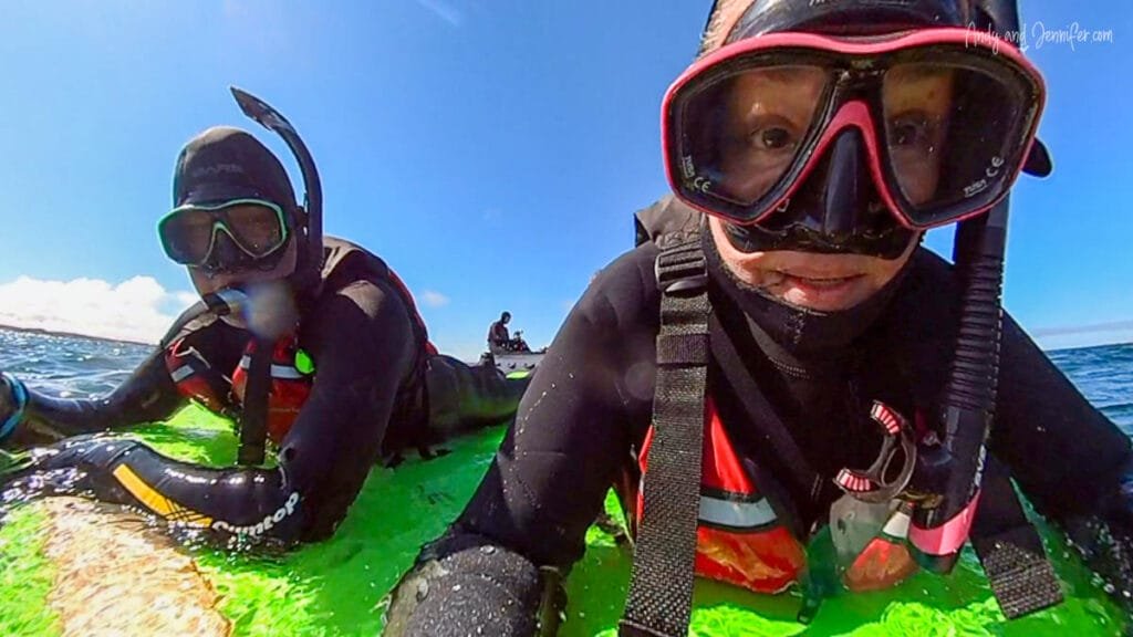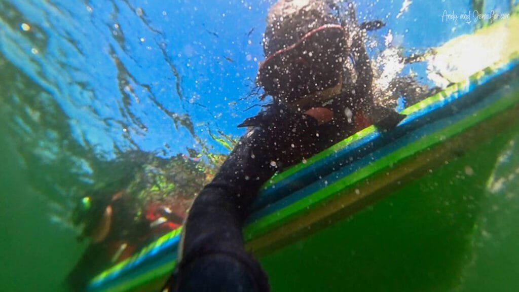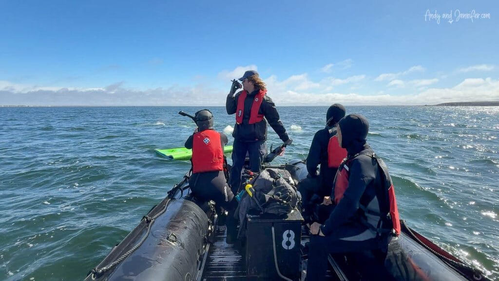 In the afternoon, we returned to the marina. Lazy Bear has a smooth setup: one large room for collecting wetsuits, hoods, gloves, booties, masks and snorkels, and another room for changing and getting life vests. With water temps around 10°C (50°F), we were glad to have all of the extra layers. We brought our own masks and snorkels, because our masks are prescription and I don’t like loaner snorkels, but their equipment looked brand new.