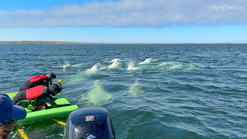 Our group of 20 split across four zodiacs. We had six passengers in our boat plus a guide. Within minutes of leaving the dock we were surrounded by belugas.