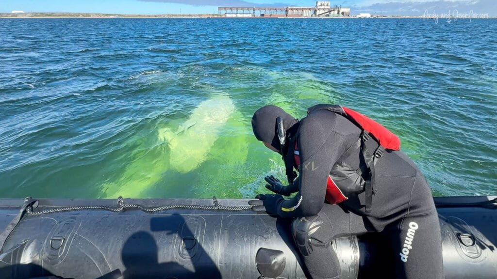 Belugas are naturally curious, but the trick is to make noise. Our guide encouraged us to make noise into the water, which meant singing, squealing or shrieking. When it was time to go in the water, the other two couples hesitated, with one asking if belugas bite, so Andy and I volunteered to go first. (This pic isn’t us – but just to show how it works)