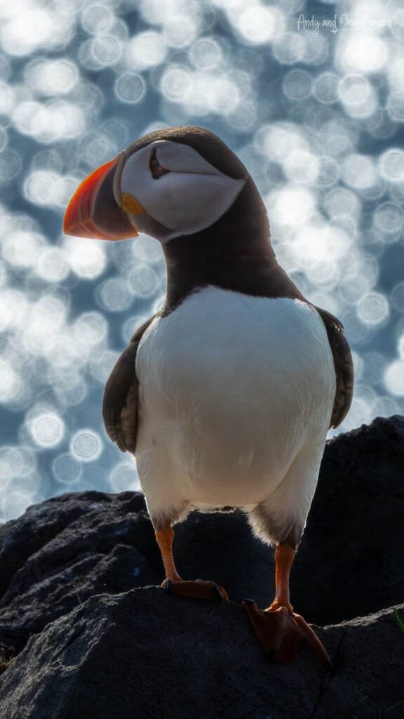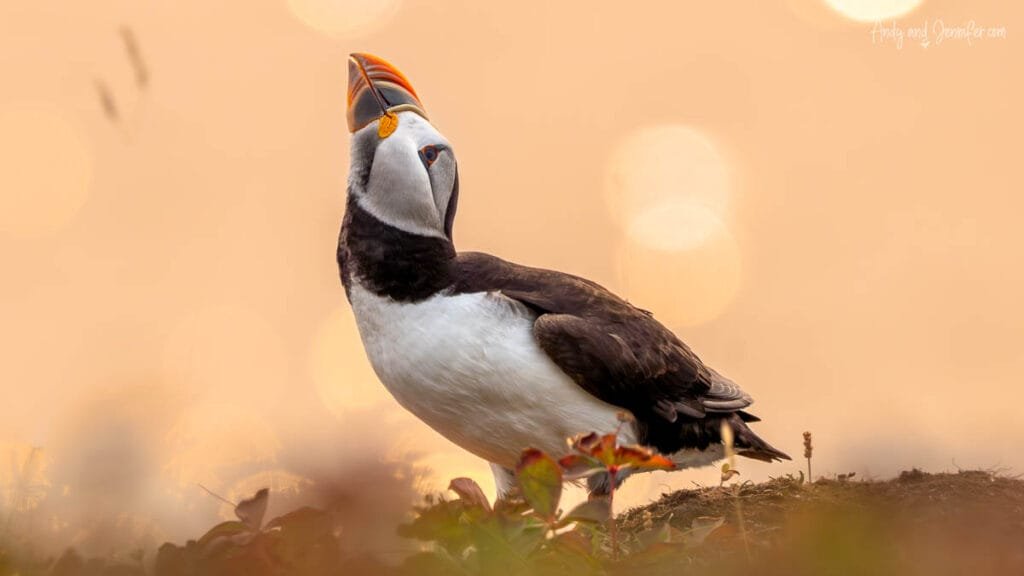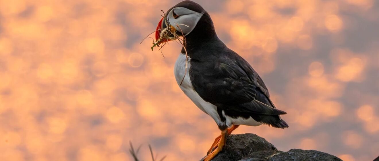 Because the cliffs face east, the early morning sun creates beautiful backlighting that turns the grass into a glowing halo and produces that dreamy photographic effect known as bokeh. Puffins landing along the cliff edge appear almost illuminated as they shuffle toward their burrows.